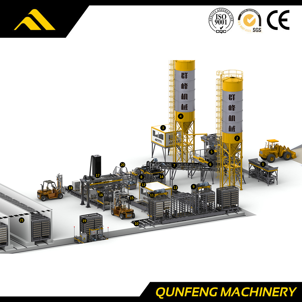 | 7. Transportador de correia | 8.Máquina para fazer blocos | 9. Elevador | 10. Transportador de rack de cura | 11. Rebaixador | 12. Sistema de Controle Central |